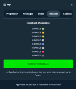 Rakeback is a percentage of your wagers that’s returned to you. It accumulates over time and can be claimed in your VIP area.