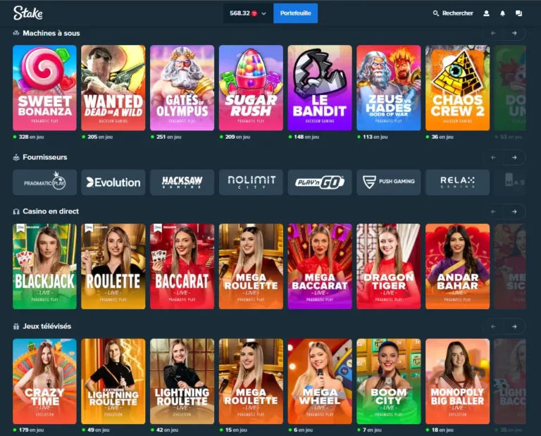 Parcourez la gamme géante de jeux de casino de Stake. Jouez aux machines à sous, au casino en direct, au blackjack, au baccarat, à la roulette et à des milliers de jeux de casino classiques directement depuis votre navigateur, y compris les jeux Originaux Stake .